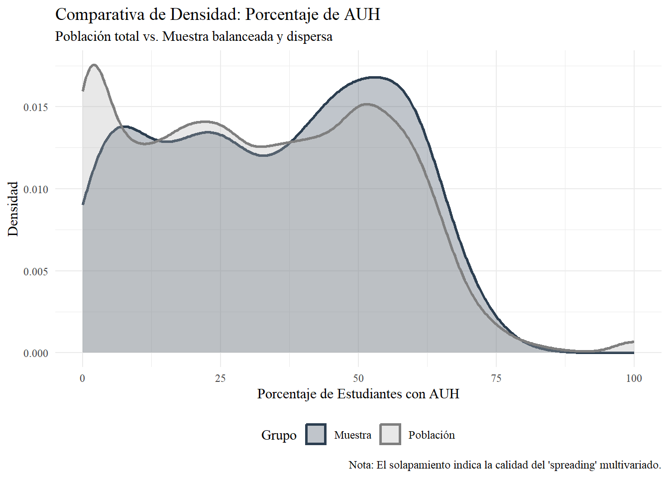 La idea de estos es que la muestra (de estudiantes y no de establecimientos) se acerque a los valores de tendencia central de esas variables. En otras palabras, que la muestra se encuentra balanceada en un punto óptimo que reduzca las distancias con las diferentes medidas de tendencia central de las variables anteriores.