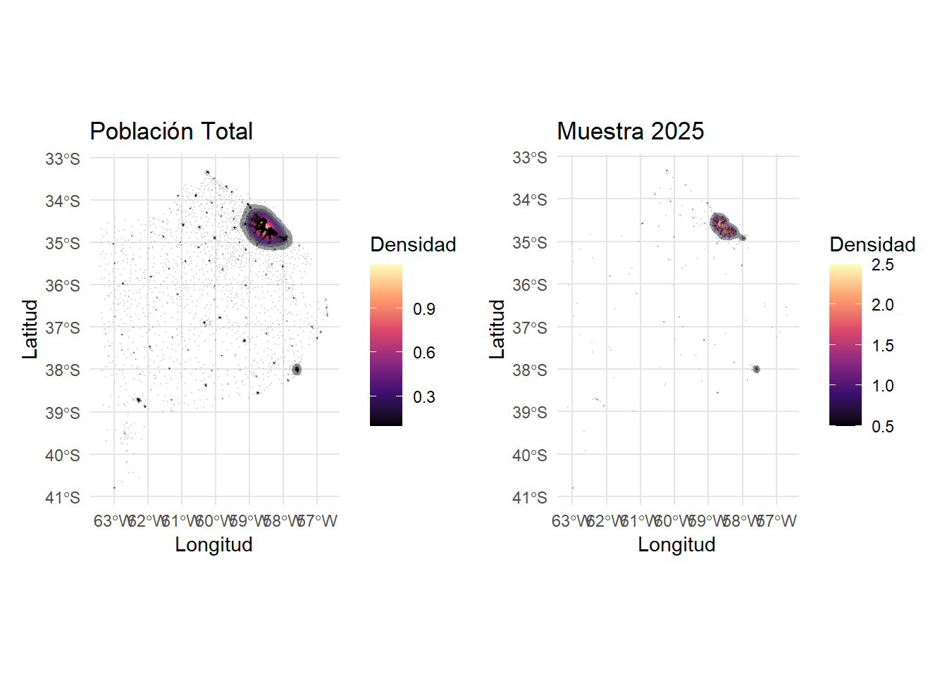 Dado que la muestra no es solo balanceada en sus medidas de tendencia central, sino también en la distribución de otras covariables ahora veremos justamente como la distribución de la muestra difiere, en las variables latitud, longitud (Figura 6.2) y porcentaje de AUH (Figura 6.4), de la distribución de las mismas a nivel del marco muestral.