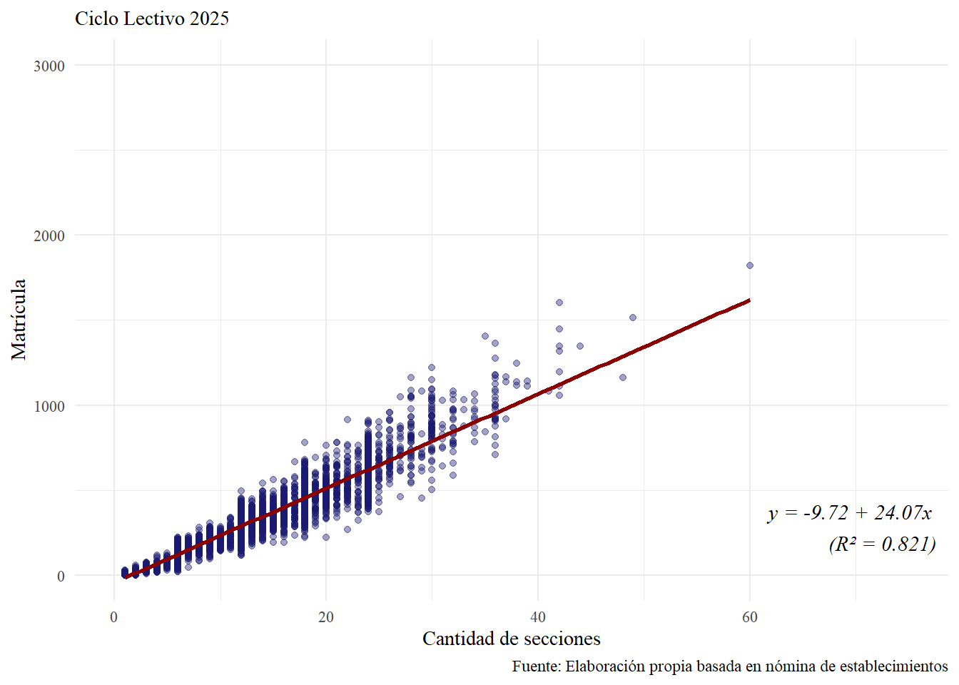 De esta manera, a pesar de no ser la típica consecuencia buscada de la estratificación, aquellos establecimientos con mayor cantidad de secciones (y en general con mayor matrícula) pueden tener una mayor chances de incluir a sus estudiantes en la muestra. En efecto, en la Figura 6.1 se observa una relación estrecha entre el tamaño de la matrícula y la cantidad de secciones del establecimiento.