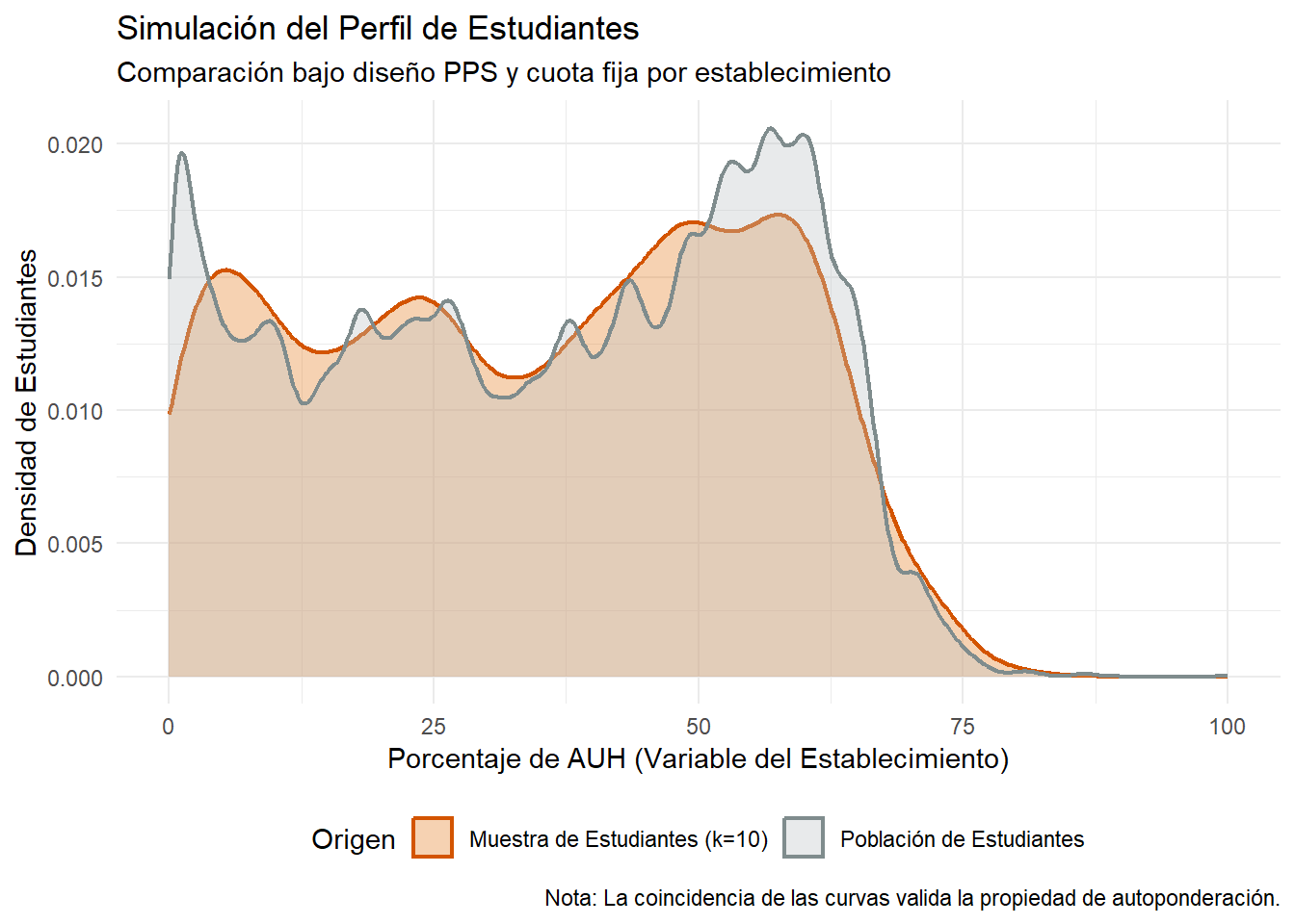 El punto 3.2 y el punto 3.3 merecen algo más de justificación porque pueden parecer contraintuitivos. En efecto, que en la primera etapa los establecimientos sean seleccionados en función del tamaño de la matrícula permite que, para la segunda etapa de la muestra, se pueda tener una regla simple como la asignación de un número fijo de estudiantes para cada establecimiento. Esto, además, permite (en ausencia de problemas de no-respuesta) hacer análisis con una muestra autoponderada. Más concretamente se aspira a registrar 10 estudiantes de cada establecimiento.