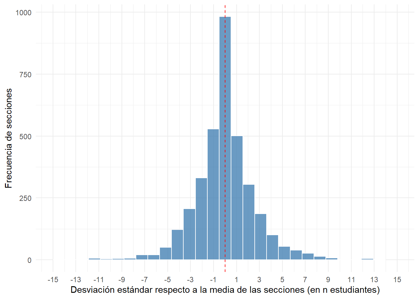 Lo anterior puede analizarce de modo empírico de dos modos diferentes. Primero analizaremos la distribución, medida a través de la desviación estándar, de todas las secciones con respecto a su respectiva media de tamaño para su mismo establecimiento y año. Esto nos va a permitir captar la heterogeneridad en función de la misma unidad que se utiliza para calcular la media que, en este caso, es la cantidad de estudiantes. En la Figura 6.6 se observa como, si bien con una distribución normal, existen divergencias con respecto a la media. Esto asegura que, si se seleccionara siempre a las secciones más grandes del tandem establecimiento/año, efectivamente la muestra estaría compuesta casi exclusivamente por secciones que se encuentran por encima de su respectiva media. Claro está que la mayoría de ellas estaría compuesta por secciones que sobrepasan por pocos estudiantes (2 estudiantes) a su respectiva media.
